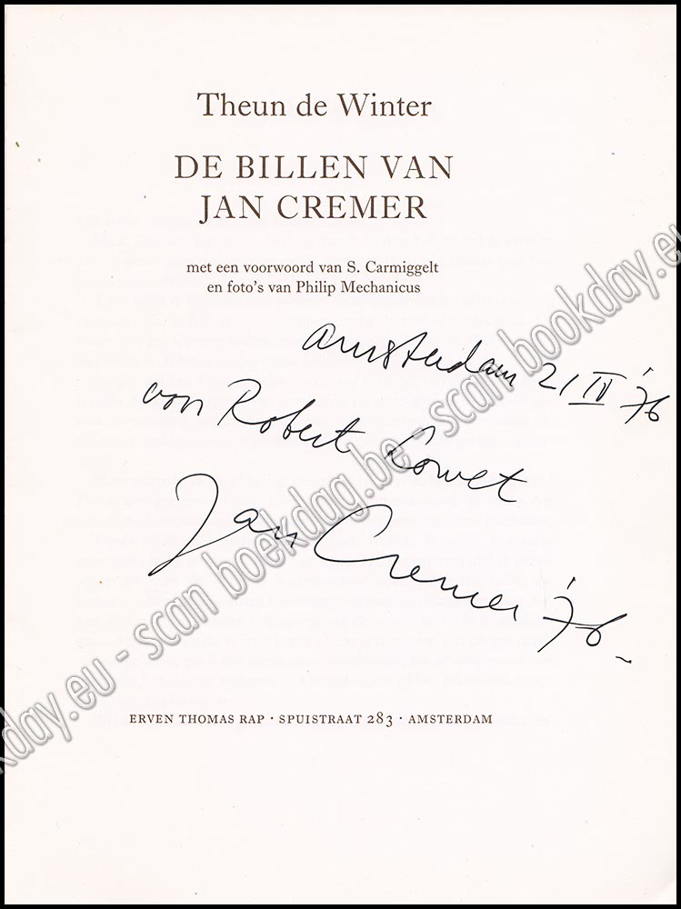 - Met opdracht (5 woorden) van Jan Cremer aan Robert Lowet de Wotrenge pp, Gesigneerd en gedateerd Amsterdam '76.