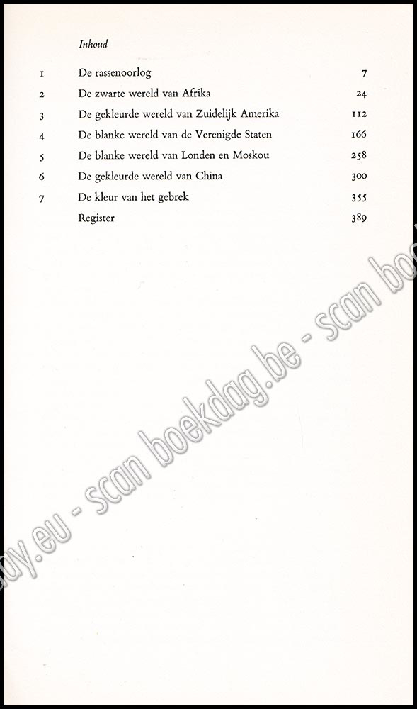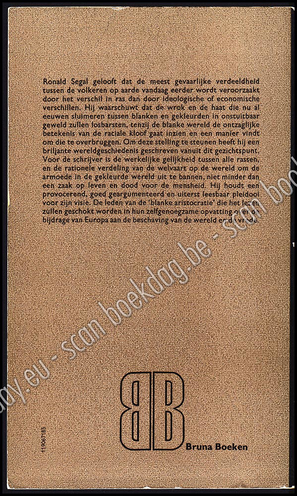 - Ronald Segal gelooft dat de meest gevaarlijke verdeeldheid tussen de volkeren op aarde vandaag eerder wordt veroorzaakt door het verschil in ras dan door ideologische of economische verschillen. Hij waarschuwt dat de wrok en de haat die nu al eeuwen sluimeren tussen blanken en gekleurden in onstuitbaar geweld zullen losbarsten, tenzij de blanke wereld de ontzaglijke betekenis van de raciale kloof gaat inzien en een manier vindt om die te overbruggen. Om deze stelling te steunen heeft hij een briljante wereldgeschiedenis geschreven vanuit dit gezichtspunt. Voor de schrijver is de werkelijke gelijkheid tussen alle rassen, en de rationele verdeling van de welvaart op de wereld om de armoede in de gekleurde wereld uit te bannen, niet minder dan een zaak op leven en dood voor de mensheid. Hij houdt een provocerend, goed geargumenteerd en uiterst leesbaar pleidooi voor zijn visie. De leden van de 'blanke aristocratie' die het lezen zullen geschokt worden in hun zelfgenoegzame opvatting over de bijdrage van Europa aan de beschaving van de wereld en de vrede.