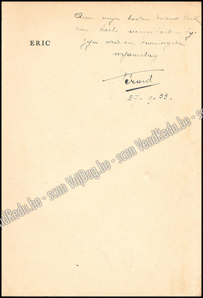 - Met een uitgebreide opdracht "Aan mijn besten vriend Arthur (Marissen) ..., gesigneerd Gérard 27-9-33.- Arthur Marissen (1900–1980) was de boezemvriend en belangrijkste vertrouweling van de Vlaamse schrijver Gerard Walschap. Hun band ontstond in hun jeugd en bleef bestaan tot aan Marissens dood in 1980. Walschap beschouwde hem als zijn enige echte zielsverwant en noemde hem zijn "vriend door alle jaren heen".Marissen was geen publiek figuur, maar speelde achter de schermen een grote rol. Hij was de eerste die de manuscripten van Walschap las en van kritiek voorzag. Hij steunde Walschap onvoorwaardelijk toen deze in de jaren '30 door de katholieke kerk werd verguisd vanwege zijn vernieuwende en controversiële romans.De vriendschap is uitvoerig gedocumenteerd in een enorme hoeveelheid brieven. Deze correspondentie is van onschatbare waarde voor literatuuronderzoekers omdat Walschap zich hierin zeer openhartig uitliet over zijn twijfels, zijn geloofsafval en zijn schrijfproces.Marissen woonde in Antwerpen en werkte als bediende. Ondanks zijn bescheiden maatschappelijke positie was hij intellectueel de gelijke van Walschap. Na de dood van Arthur Marissen bleef Walschap hem herdenken als de persoon die hem het beste begreep en die zijn literaire loopbaan moreel mogelijk had gemaakt. (AI)