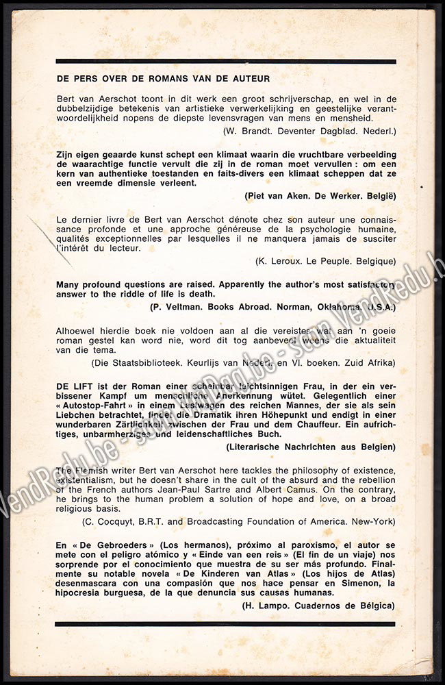 - Bert Van Aerschot: Vlaams romanschrijver (Lier 3.3.1917). Studeerde aan de Antwerpse Academie, was werkzaam in het bouwbedrijf en bij de televisie. Debuteerde in 1942 met de roman De kleine wereld, bundelde tien jaar later drie novellen onder de titel Ik leefde gisteren en gaf daarna vitalistische romans uit, waarvan de eerste drie een naturalistische en sterk sensuele inslag hebben. Zijn later werk Einde van een reis (1959) getuigt van een mildere kijk op het leven.