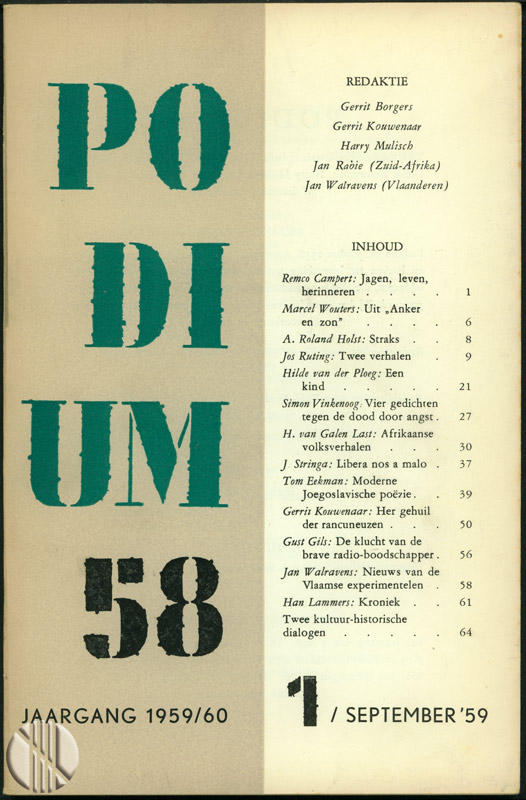 In deze complete jaargang (6 nummers) bijdragen van: Remco Campert, Marcel Wauters, A. Roland Holst, Jos Ruting, Hilde van der Ploeg, Simon Vinkenoog, H. van Galen Last, J. Stringa, Tom Eekman, Gerrit Kouwenaar, Gust Gils, Jan Walravens, Han Lammers, H.A.L., H.J.A. Hofland, Jan Hanlo, Harry Mullisch, Cees Nooteboom, Jan G. Elburg, Cor van de Poel, Eldert Willems, Gerrit Huizer, Sybren Polet, Willem Frederik Hermans, Lucebert, Jan Wolkers, Gust Gils, Hans Sleutelaar, Jos Ruting, Willi Albrecht, Jan van Maastricht, Tone Brulin, Bartho Smit, René Gysen, Paul Snoek, Cornelis Bastiaan Vaandrager, Ingrid Jonker, Theo J. van der Wal, Hans Verhagen, H. van der Ploeg, Simon Vinkenoog, Jan Rabie, Rudolf de Jong, Cees Nooteboom, Carl Lans, Bloke Modisane, S.P., R.C. en Hfl.