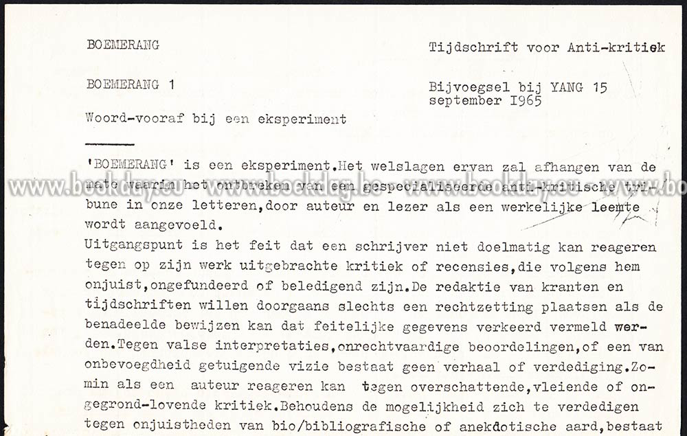 - Yang 15 a+b. + (Boemerang 1 als bijvoegsel, tijdschrift voor Anti-kritiek. Bestaande uit 1 vel papier recto-verso bedrukt.)- inhoud 15: jan emiel daele: fragmenten uit liefste otto daniël van ryssel: god in vlaanderen simon vinkenoog: bij de dood van piet tri (17 juni 1965) johny van doorn: het einde van een trisniffer marcel van maele : trage gebaren roken uit de bundel: in-graven hans plomp: w.g. van focquenbroch of zedenmeesters in onderbroek weverbergh: projekt gemini 1: blauw rapen herwig leus: projekt gemini 1: een rode draad volgen: een duiding roger serras: de ratten verlaten het schip: gedichten herman j. claeys: (de hoornblazer) w.a. wilmink: hondeliedje rené hooyberghs: gedichten klein kubiek: hans plomp: het epos van de glorie rené gysen: open brief aan leus herwig leus: antwoord aan rené gysen adriaan maas: het j.n.l.t. weverbergh: andries poppe: dichter bij genade gods herman j. claeys: mop van de maand jan emiel daele: noten.