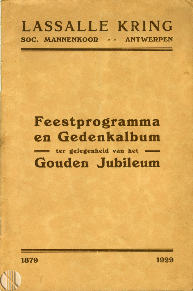 Programma van de festiviteiten en geschiedenis van de Kring. Lassallekring, Socialistisch Mannenkoor Antwerpen, Gesticht 7 Augustus 1879. Voorzitter: P. Somers; Leider: Karel Candael. Geïllustreerd met vele foto`s van bekende leden en groepsfoto`s.