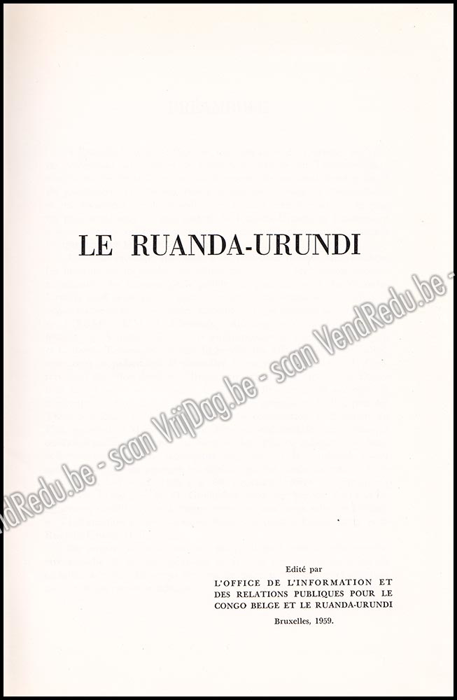 << Ruanda-Urundi 1959 >> est une tentative de synthèse, un essai de description du passé et de l'évolution actuelle du Territoire placé sous la tutelle de la Belgique, un inventaire de ses institutions et de sa vie journalière. Il voudrait être à la fois un ouvrage de vulgarisation et un document qu'on consulte, servir aussi bien à ceux de plus en plus nombreux qui visitent le Ruanda-Urundi et s'intéressent à ses problèmes, qu'à tous ceux qui y vivent, qui y reçoivent l'instruction ou qui désirent le servir.