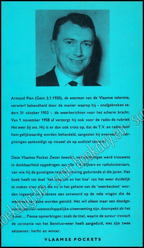 - Armand Pien (°Gent 2.1.1920 - †Gent 22.9.2003), de weerman van de Vlaamse televisie, verwierf bekendheid door de manier waarop hij. - onafgebroken sedert 31 oktober 1953 - de weerberichten voor het scherm bracht. Van 1 november 1958 af verzorgt hij ook voor de radio de rubriek Het weer bij ons. Hij is er dan ook trots op, dat de T.V. en radio door hem gelijkwaardig worden behandeld, aangezien hij evenveel ... vergissingen aankondigt op visueel als op auditief terrein! Deze Vlaamse Pocket Zwaar bewolkt, met opklaringen werd trouwens in dankbaarheid opgedragen aan alle T.V.-kijkers en radioluisteraars, van wie hij de gunstigste reacties ontving gedurende al die jaren. Het boek heeft tot doel 'het waarom en het hoe' van het weer duidelijk te maken voor allen die nu in het geheim van de 'weerkeuken' worden ingewijd en is tevens een antwoord op de vele vragen die de weerman ter zake worden gesteld. Het wil alleen maar een doodgewone populair-wetenschappelijke uiteenzetting zijn, doorspekt als het is met ... Piense opmerkingen; zoals de titel, waarin de auteur ironisch de constante van het Benelux-weer heeft aangeduid, met zijn twee seizoenen: herfst en winter.