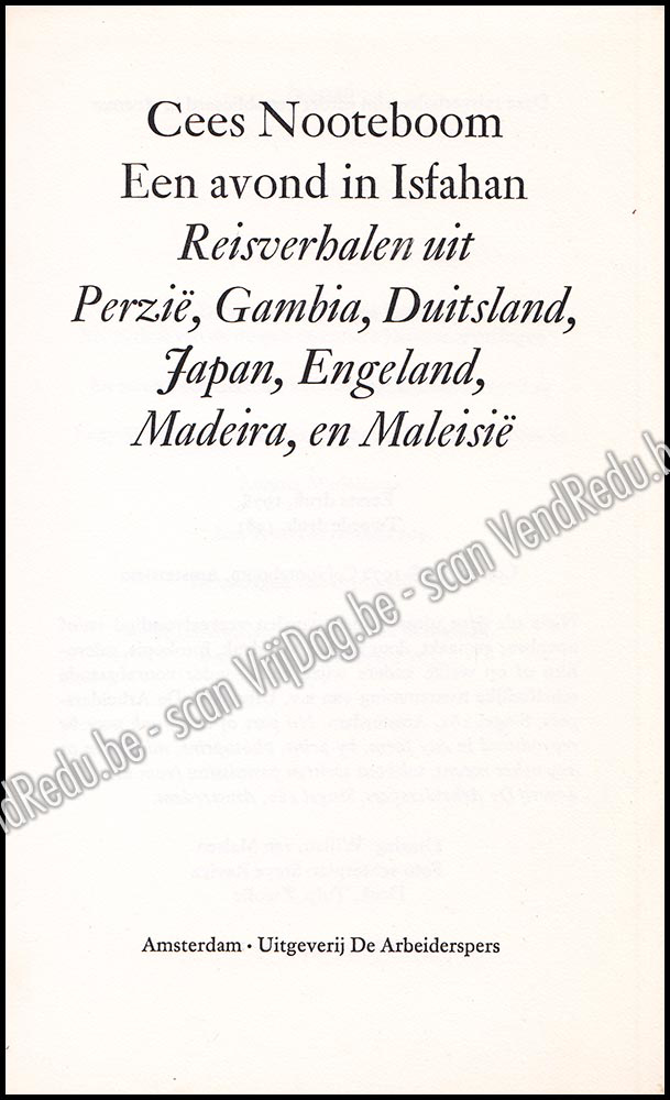 - Cees Nooteboom heeft van de reisreportage een literair genre op zich gemaakt. Zijn verslagen, alle eerder gepubliceerd in Avenue, blinken uit door nauwkeurige observatie van details die meestal over het hoofd worden gezien, maar ook door een sociaal-kritische benadering van mensen en samenlevingen die men in reisboeken oudestijl doorgaans niet vindt. In dit boek reist Nootebooms alziend oog over Perzië - het legendarische Isfahan -, over het misleidend-zonnige Madeira, over Japan, Maleisië, Duitsland, Engeland en Gambia. In elk reisverslag blijkt opnieuw dat hij als weinigen de kunst verstaat de essentie van een land, datgene wat een volk onderscheidt van andere volkeren, trefzeker weer te geven.