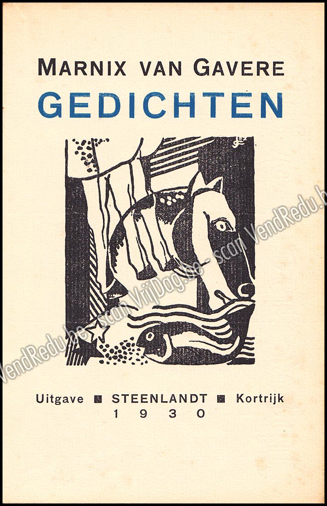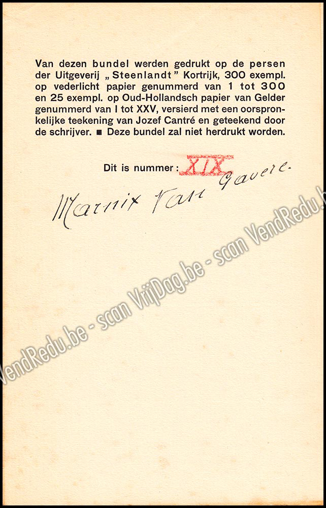 - Genummerd (Dit is nummer XIX) en gesigneerd door Marnix van Gavere, (pseudoniem van Fernand Pauwels) (Deinze, 31 december 1897 – Deinze, 27 januari 1974), hij was een Vlaamse dichter die deel uitmaakte van de post-expressionistische generatie. Naast Gedichten publiceerde hij onder meer de bundel Oude en nieuwe gedichten (1939).- Frontispice van Jozef Cantré, hij was een bekende Belgische beeldhouwer en houtsnijder, en een van de belangrijkste vertegenwoordigers van het Vlaams expressionisme. Hij illustreerde meerdere boeken, waaronder ook werk van Gerard Walschap, Ernest Claes en Paul Claudel.- Colofon: Van dezen bundel werden gedrukt op de persen der Uitgeverij, "Steenlandt" Kortrijk, 300 exempl. op vederlicht papier genummerd van 1 tot 300 en 25 exempl. op Oud-Hollandsch papier van Gelder genummerd van I tot XXV, versierd met een oorspronkelijke teekening van Jozef Cantré en geteekend door de schrijver. Deze bundel zal niet herdrukt worden. Dit is nummer: XIX.