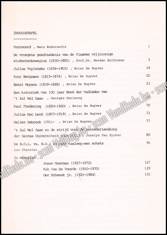 - INHOUDSTAFEL:Voorwoord, Manu Robbroeckx.De vroegste geschiedenis van de Vlaamse vrijzinnige studentenbeweging (1830-1885), Prof. Dr. Herman Balthazar.Een historiek van 100 jaar Bond der Oudleden van 't Zal Wel Gaan, Georges Declercq.'t Zal Wel Gaan en de strijd voor de vernederlandsing der Gentse Universiteit voor W.O. I, Jocelyn Van Eycken.De B.O.L. vs. W.O.I en haar nasleep:een schets, Luc Chatelet.In memoriam.