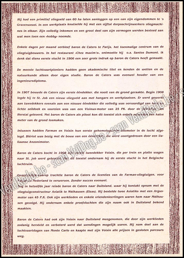 - Het boekje Luchtvaartgeschiedenis. Een Antwerpse Pionier van Th. Pulinckx is een geïllustreerde beknopte biografie van Baron Pierre de Caters. Over het boek:Titel: Luchtvaartgeschiedenis. Een Antwerpse Pionier: Baron Pierre de Caters.Auteur: Th. Pulinckx.Inhoud: Het boek is een rijk geïllustreerd biografietje die zich concentreert op het leven en de prestaties van Pierre de Caters. Verschijningsdatum: Het boekje werd in 1969 uitgegeven door de auteur.Over Pierre de Caters.Levensloop: Pierre de Caters (1875-1944) was een Belgische piloot, luchtvaartpionier en autocoureur.Prestaties: Hij was de eerste Belg die een vliegtuig bouwde, ontwierp en testte, en de eerste Belgische piloot die een vliegtuig bestuurde dat in België gebouwd was.Eerste Vlucht: Zijn eerste succesvolle vlucht vond plaats in 1908 in Sint-Denijs-Westrem.
