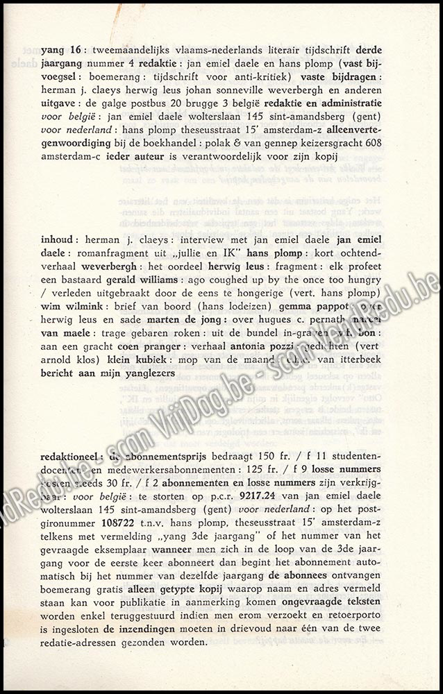- inhoud: herman j. claeys: interview met jan emiel daele jan emiel daele: romanfragment uit jullie en IK" hans plomp: kort ochtendverhaal weverbergh: het oordeel herwig leus: fragment: elk profeet een bastaard gerald williams: ago coughed up by the once too hungry / verleden uitgebraakt door de eens te hongerige (vert, hans plomp) wim wilmink: brief van boord (hans lodeizen) gemma pappot: over herwig leus en sade marten de jong: over hugues c. pernath marcel van maele: trage gebaren roken uit de bundel in-graven w.f. bon: aan een gracht coen pranger: verhaal antonia pozzi: gedichten (vert arnold klos) klein kubiek: mop van de maand: e.h.e. van itterbeek bericht aan mijn yanglezers.
