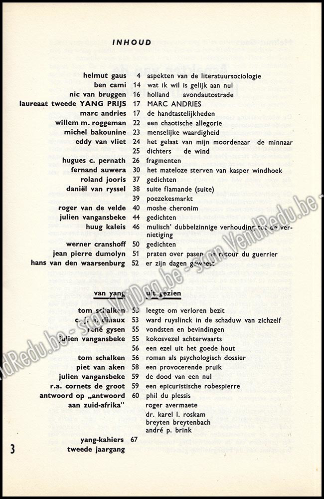 - INHOUDhelmut gaus4 aspekten van de literatuursociologieben cami14 wat ik wil is gelijk aan nulnic van bruggen 16holland avondautostradelaureaat tweede YANG PRIJSmarc andries 17de handtastelijkhedenwillem m. roggeman22 een chaotische allegorie23 menselijke waardigheideddy van vliethet gelaat van mijn moordenaar de minnaar25 dichters de windfragmentenfernand auwera 30het mateloze sterven van kasper windhoekroland jooris 37gedichtendaniël van ryssel 38roger van de velde 40poezekesmarktjulien vangansbeke 44moshe cheronimhuug kaleis 46gedichtenmulisch' dubbelzinnige verhouding tot de ver-nietigingwerner cranshoff 50gedichtenhans van den waarsenburg 52er zijn dagen geweestvan yanguit gezientom schalken 53leegte om verloren bezitward ruyslinck in de schaduw van zichzelfrené gysen 55vondsten en bevindingenjulien vangansbeke 55kokosvezel achterwaartstom schalken 56een ezel uit het goede houtpiet van aken 58roman als psychologisch dossierjulien vangansbeke 59een provocerende pruikde dood van een nulantwoord op antwoord 60een epicuristische robespierreaan zuid-afrika"roger avermaetedr. karel 1. roskambreyten breytenbachyang-kahiers 67andré p. brink